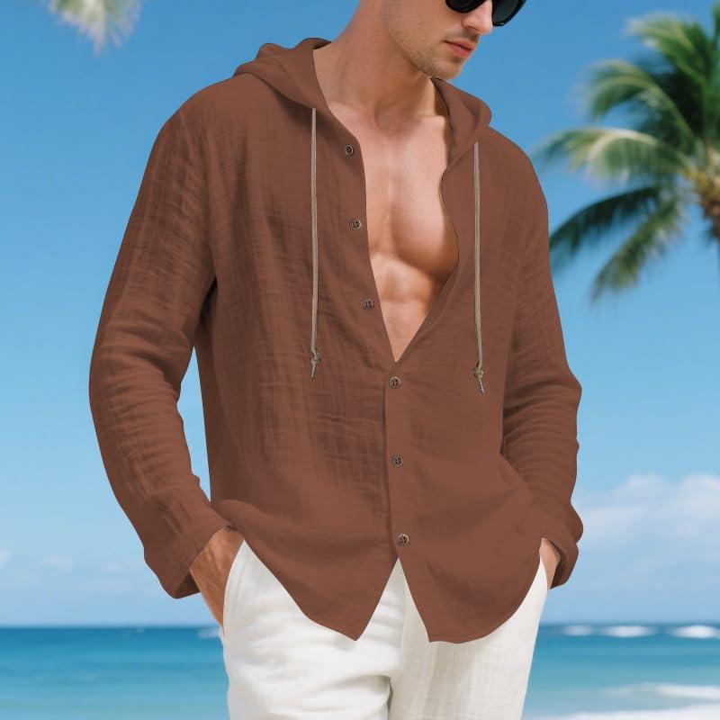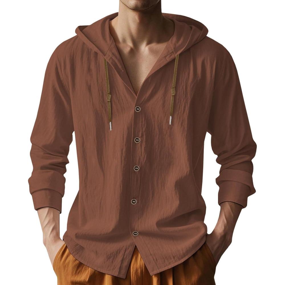 Mens Cotton Linen Hoodies Lightweight Long Sleeve Button Down Shirts Casual Hawaiian Beach Yoga Tops Sweatshirts(Brown)