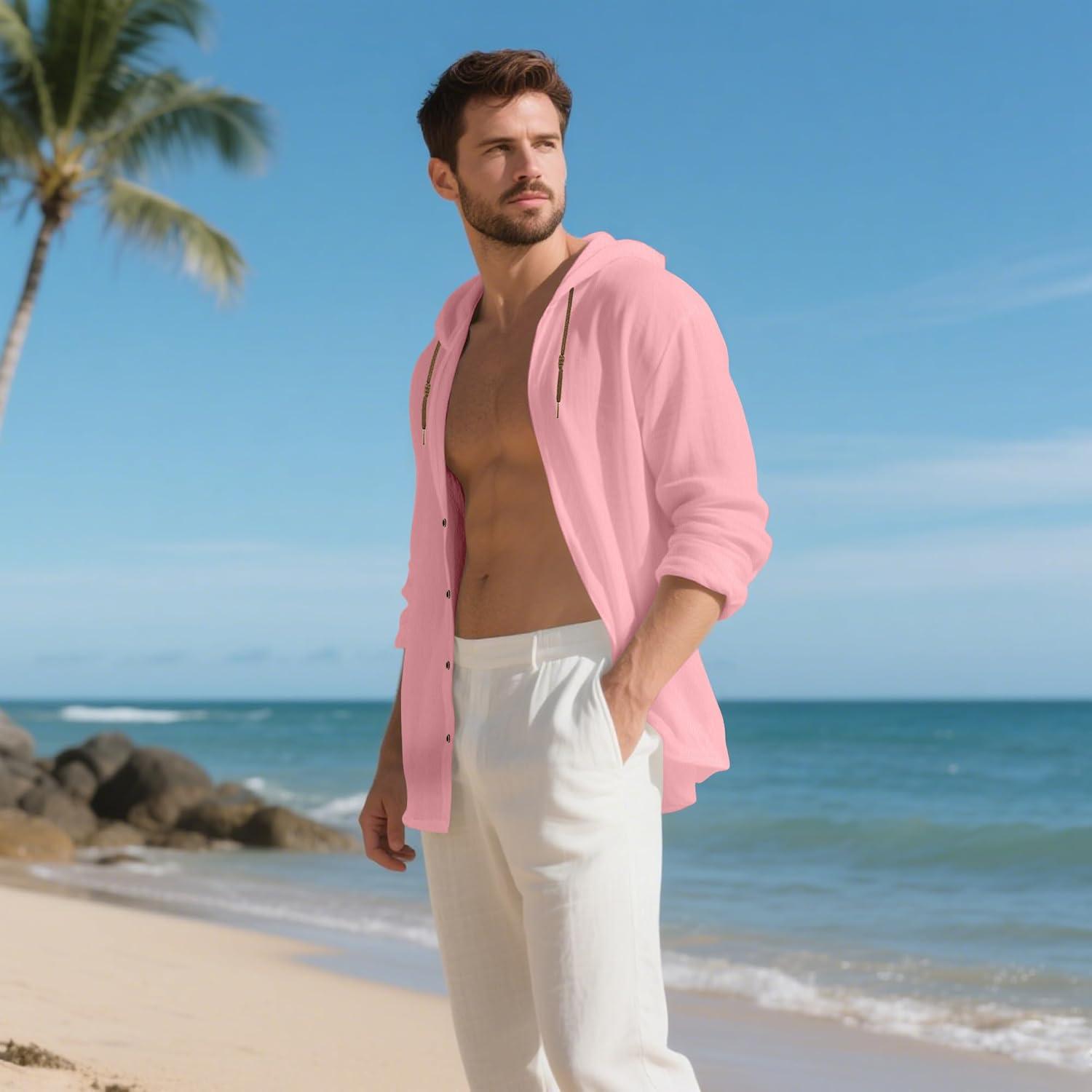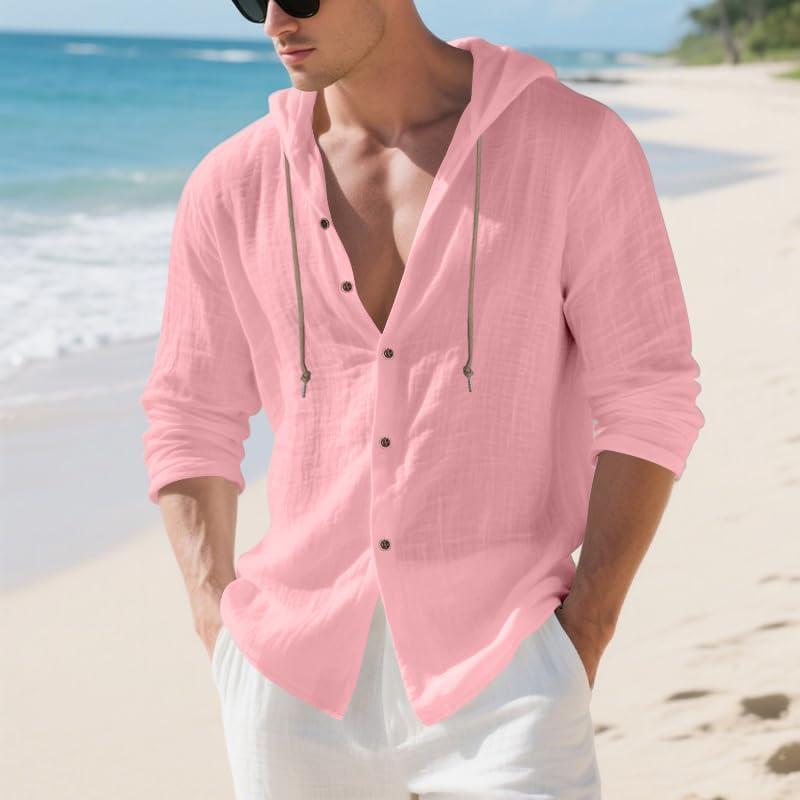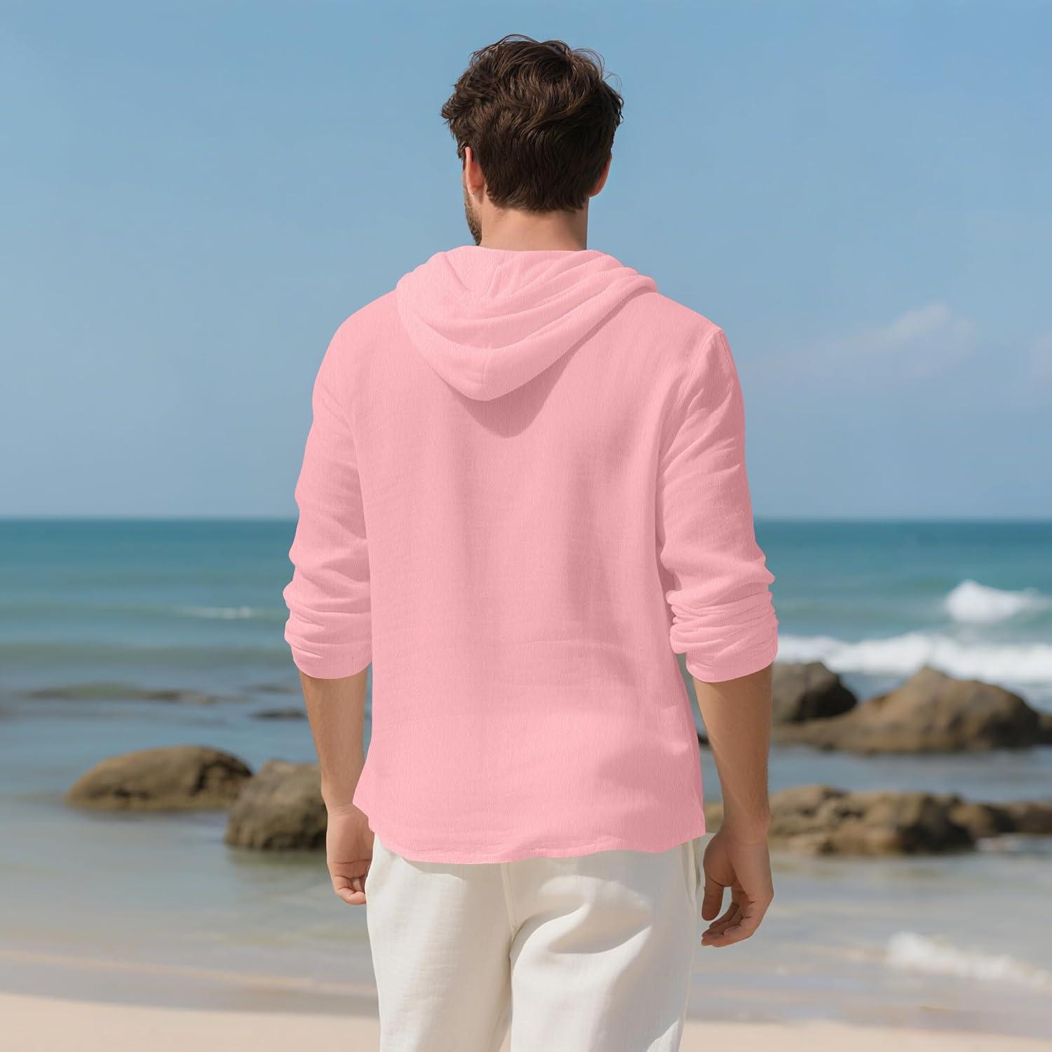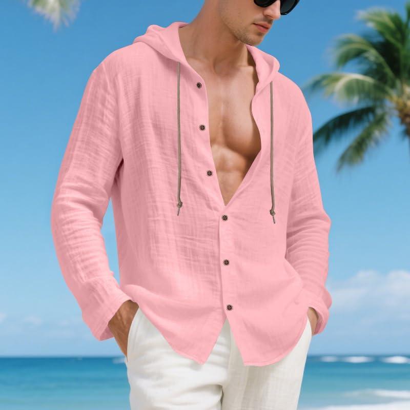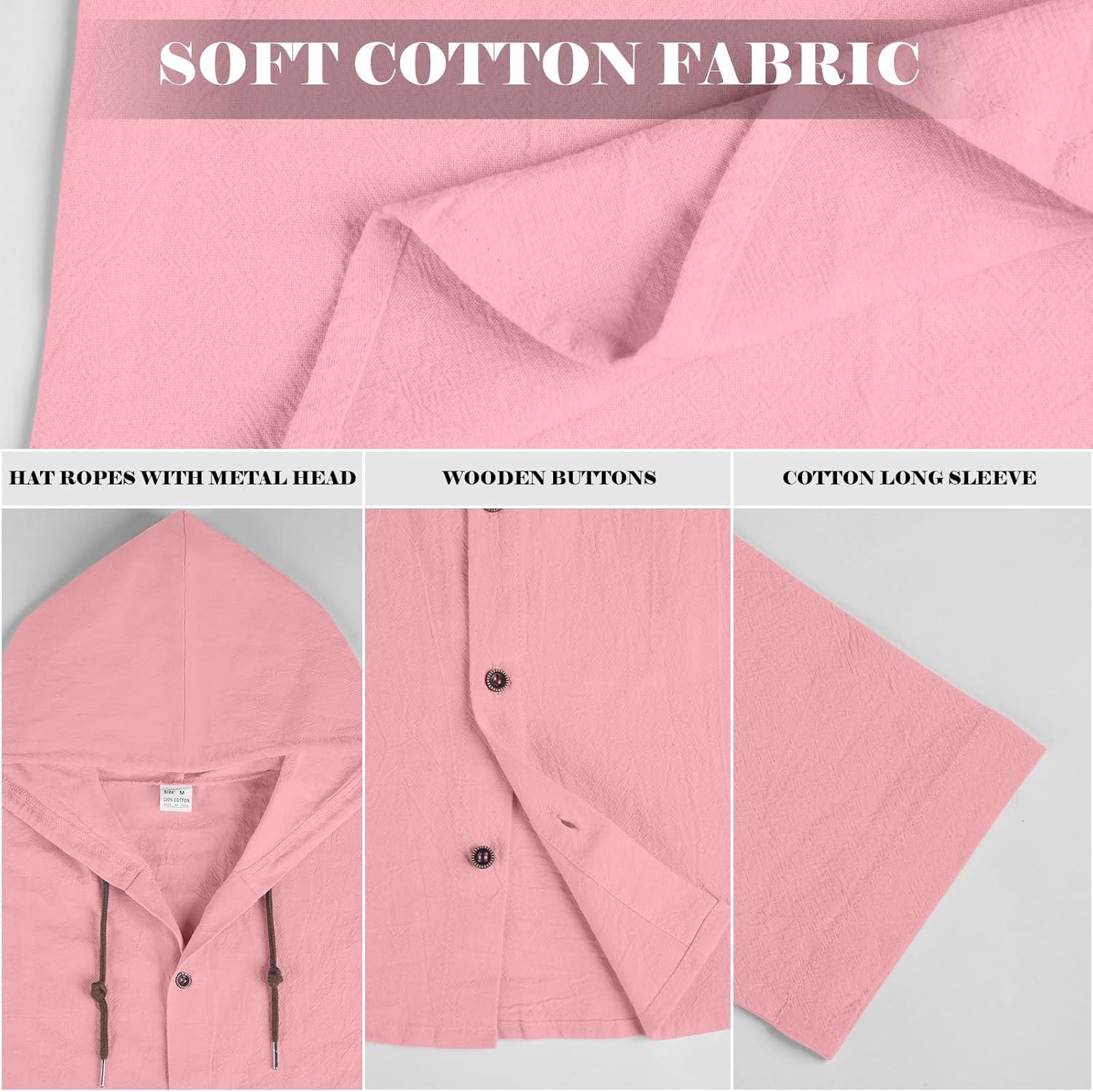 Mens Cotton Linen Hoodies Lightweight Long Sleeve Button Down Shirts Casual Hawaiian Beach Yoga Tops Sweatshirts(Pink)