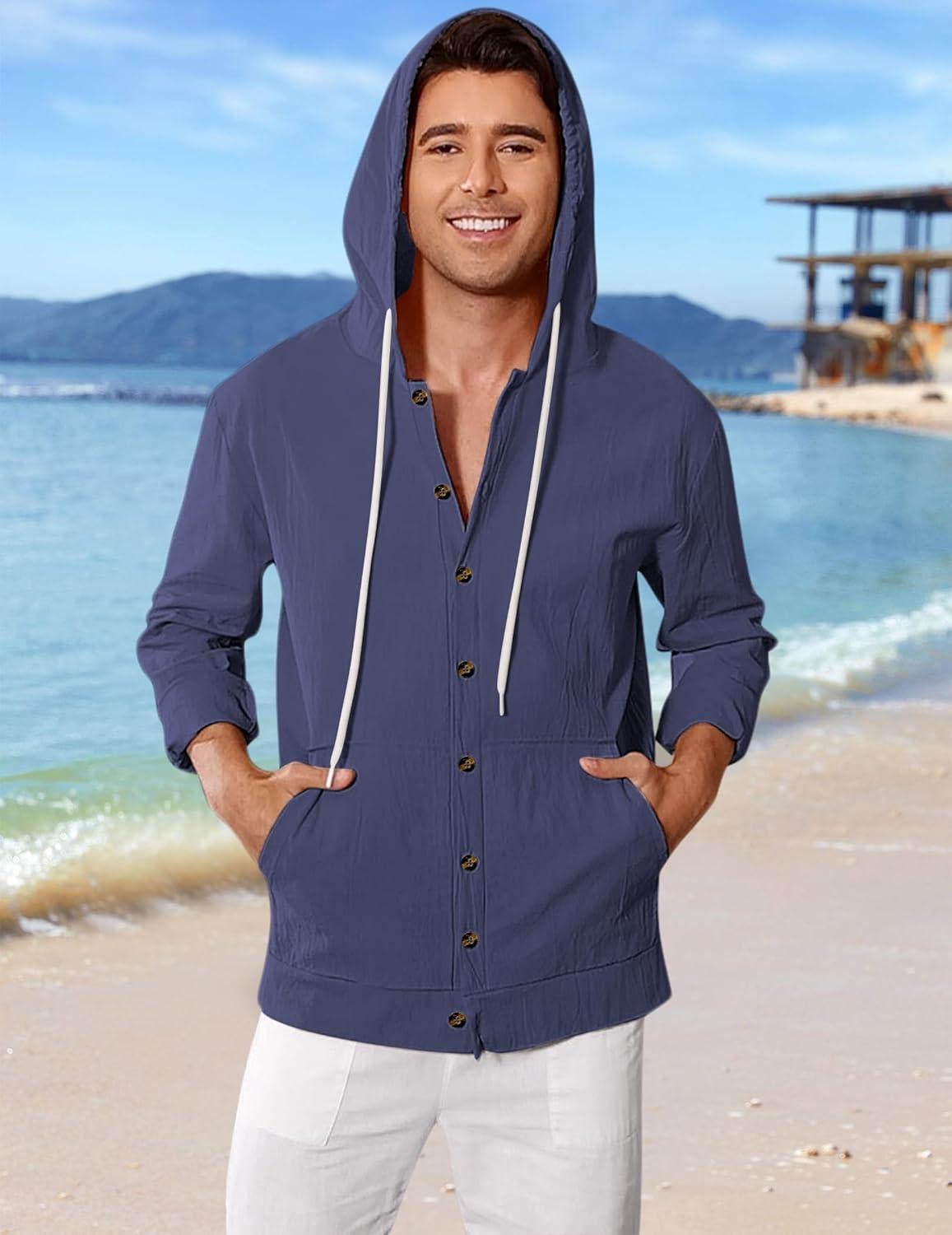 Mens Cotton Linen Long Sleeve Button Down Shirts with Pockets Casual Hawaiian Beach Shirts Lightweight Fashion Hoodies(Navy)