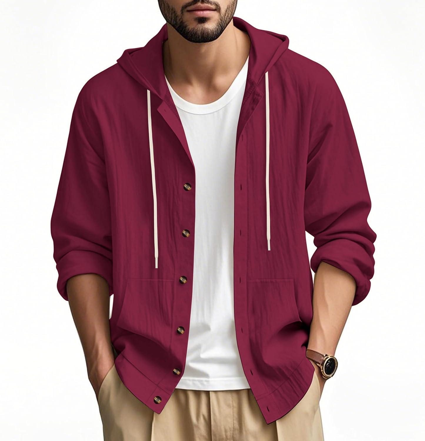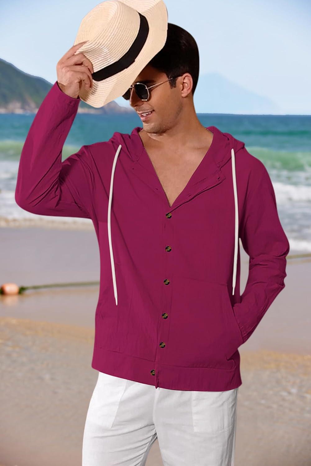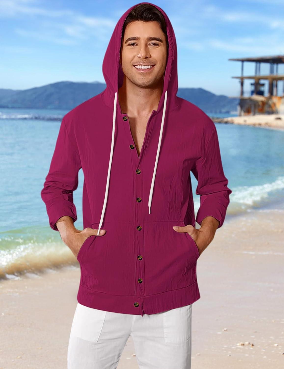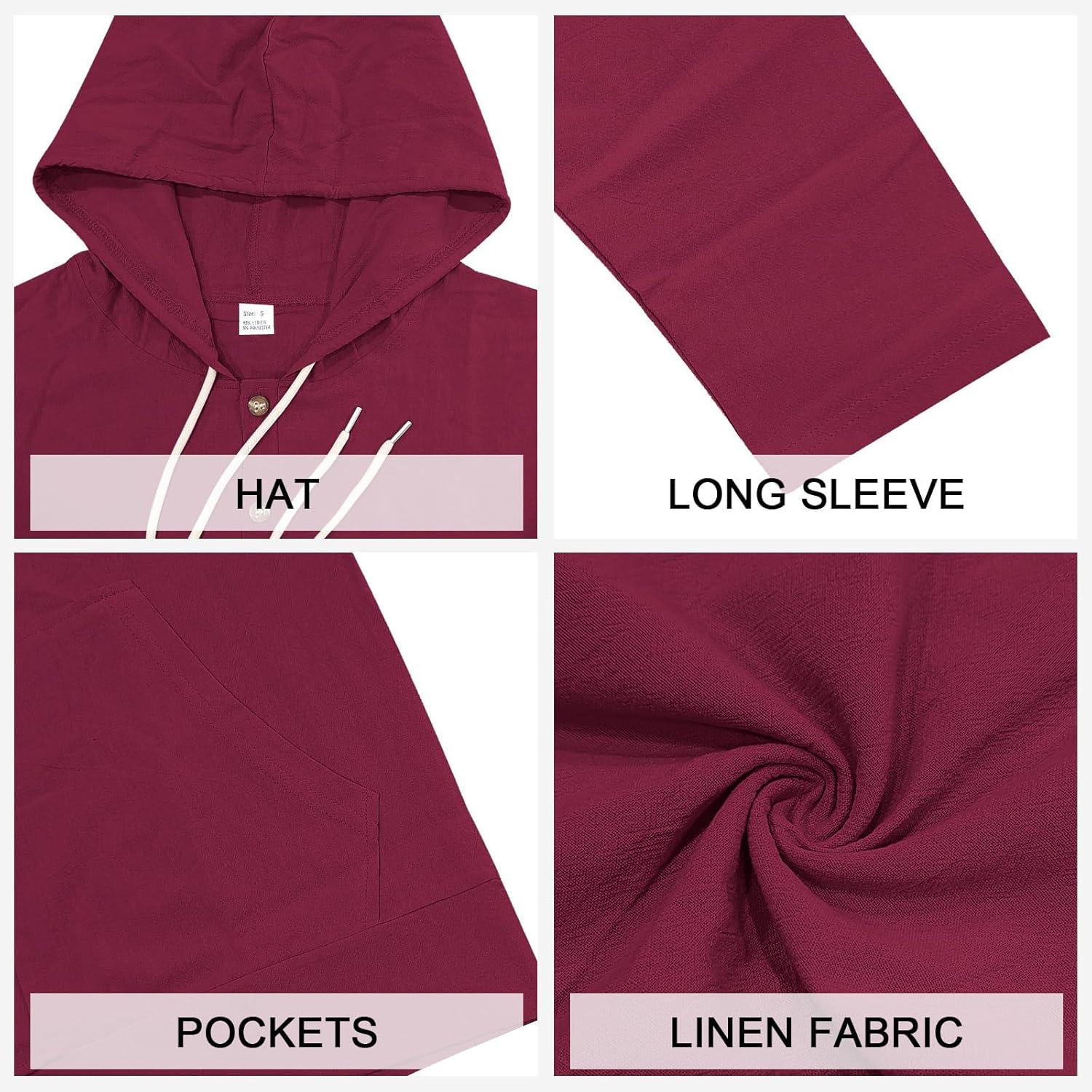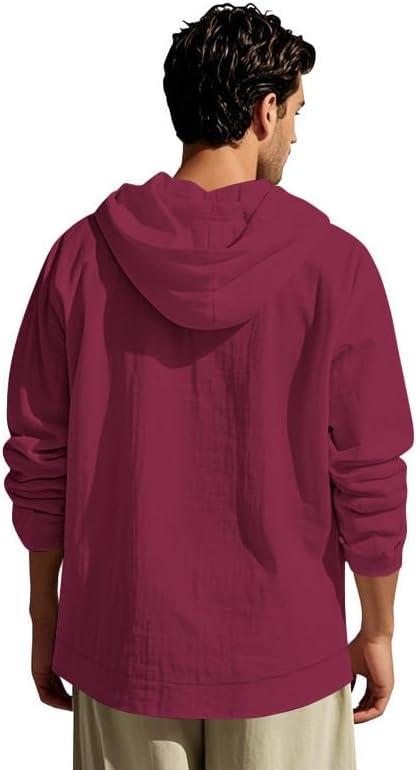 Mens Cotton Linen Long Sleeve Button Down Shirts with Pockets Casual Hawaiian Beach Shirts Lightweight Fashion Hoodies(Red Wine)