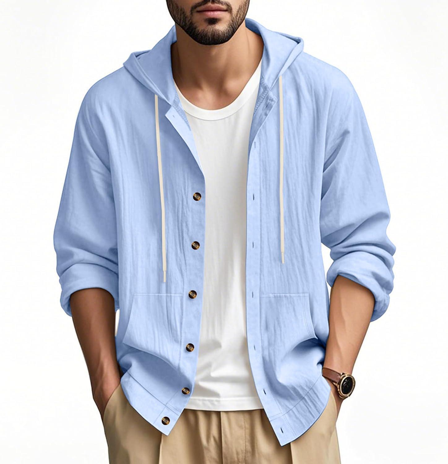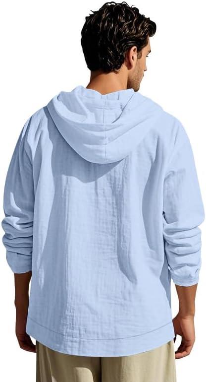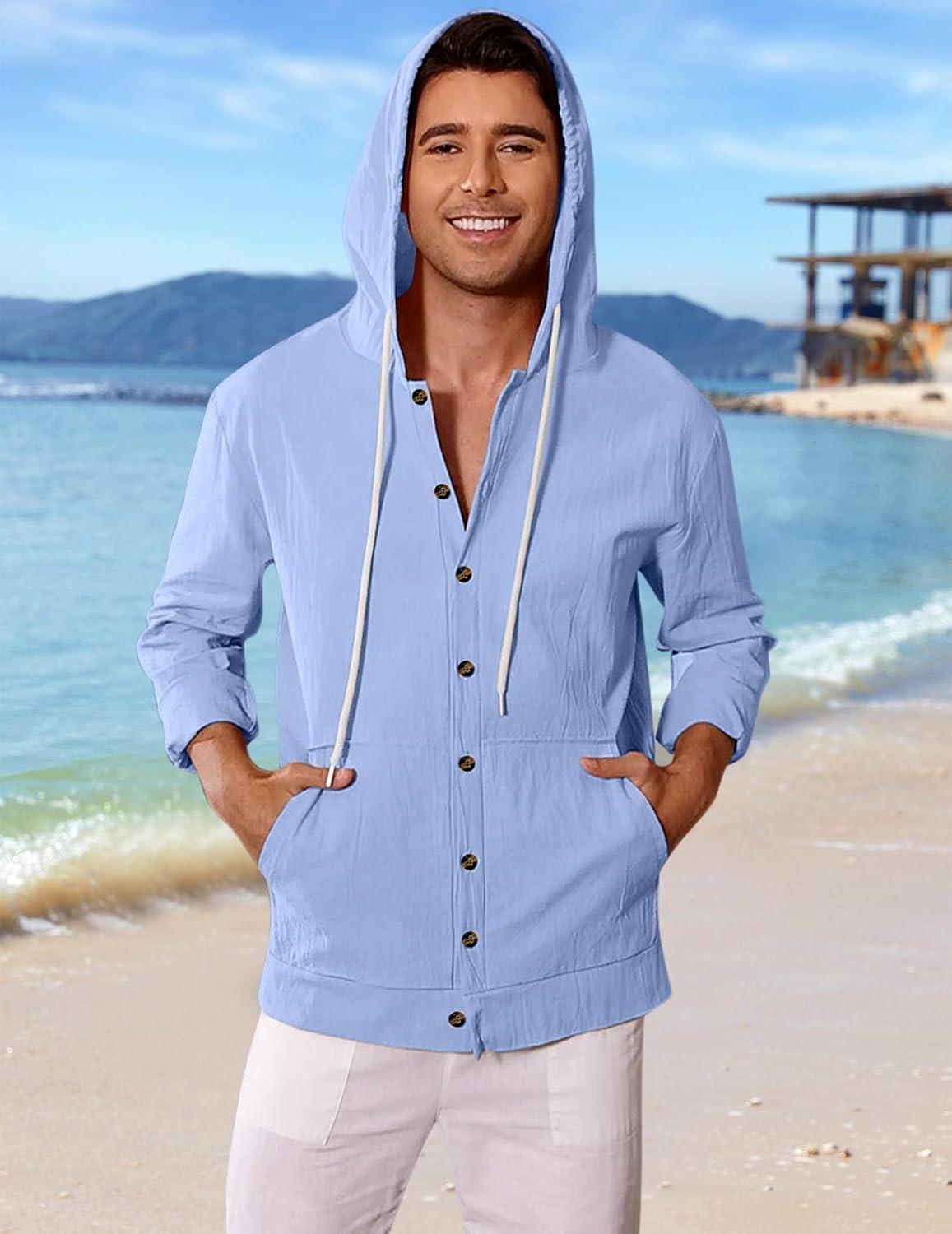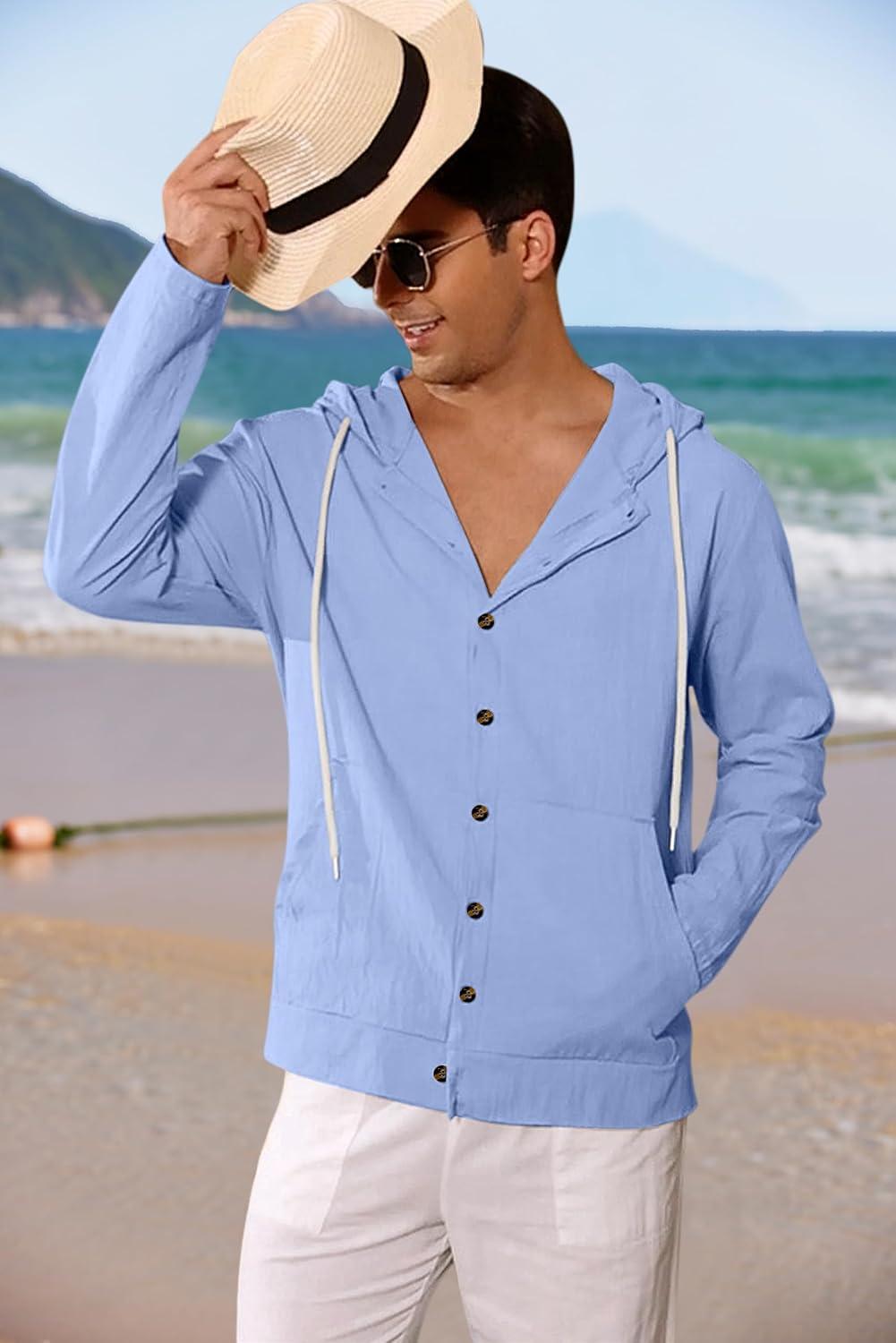 Mens Linen Long Sleeve Button Down Shirts with Pockets Casual Hawaiian Beach Shirts Lightweight Fashion Hoodies