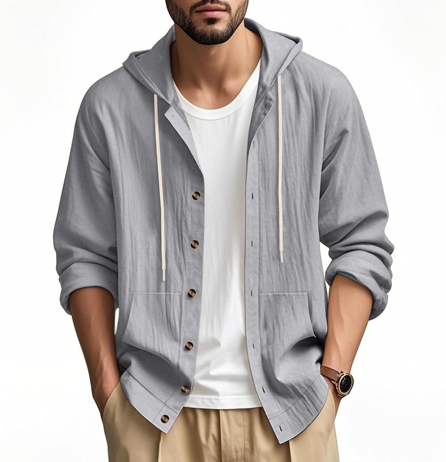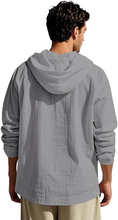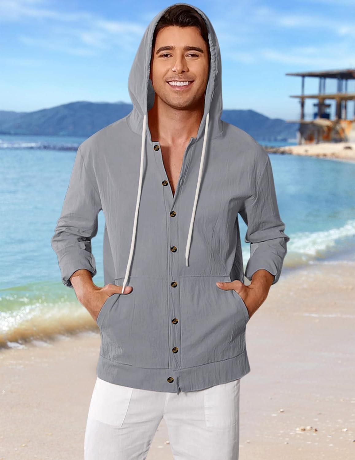 Mens Linen Long Sleeve Button Down Shirts with Pockets Casual Hawaiian Beach Shirts Lightweight Fashion Hoodies(Grey)