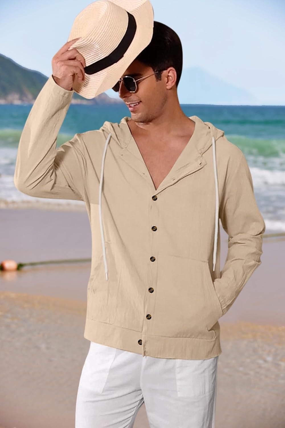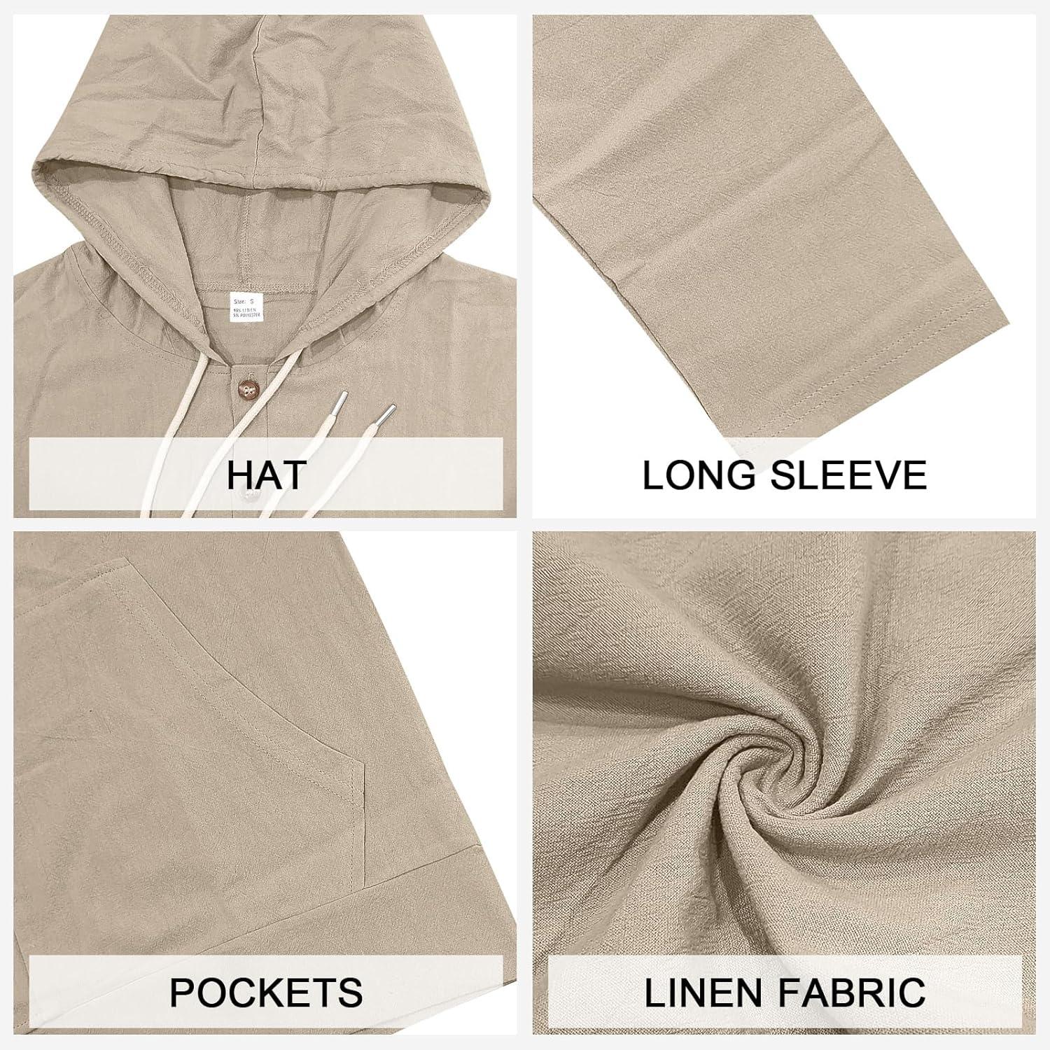 Mens Linen Long Sleeve Button Down Shirts with Pockets Casual Hawaiian Beach Shirts Lightweight Fashion Hoodies(Khaki)