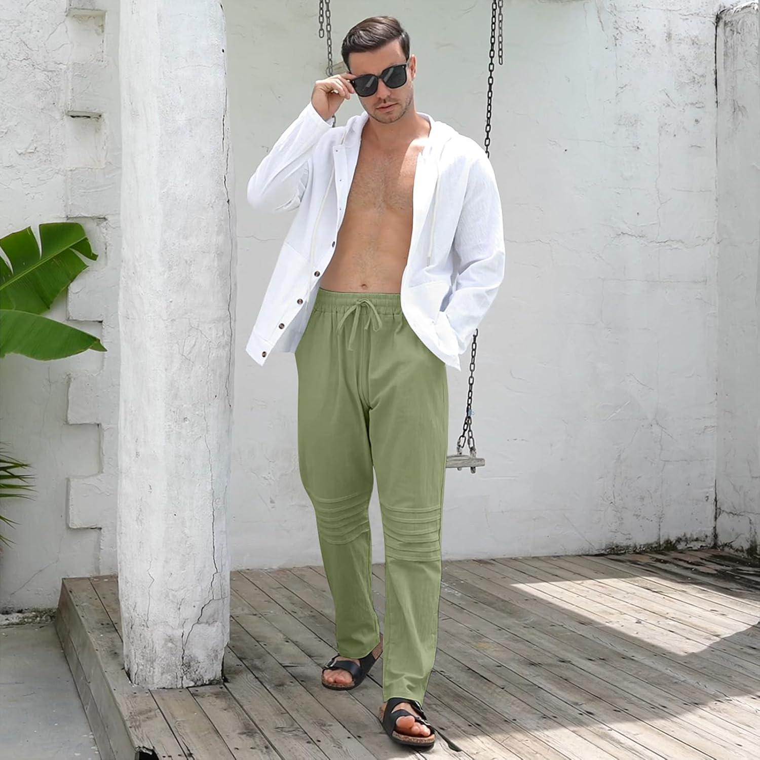 Mens Linen Pants Casual Beach Pants for Men Elastic Waist Drawstring Yoga Trousers with Pockets(Army Green)