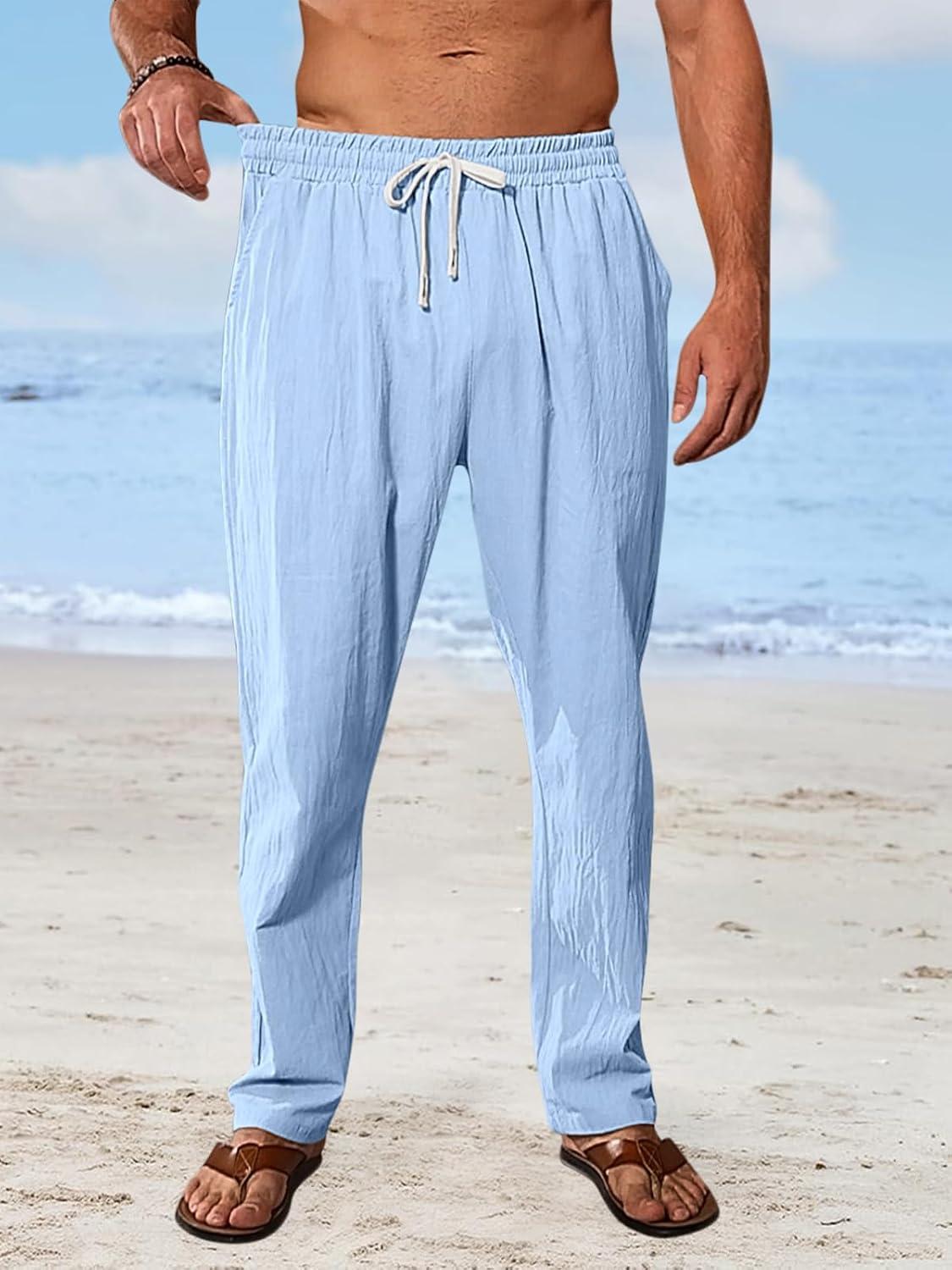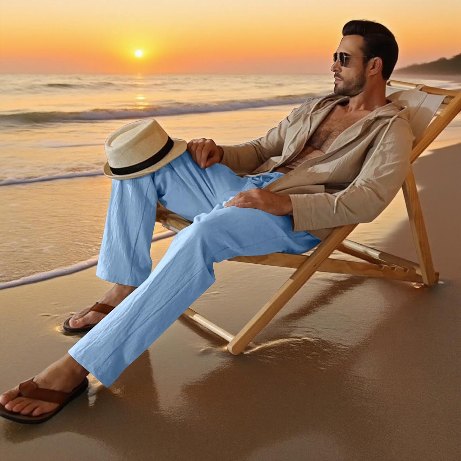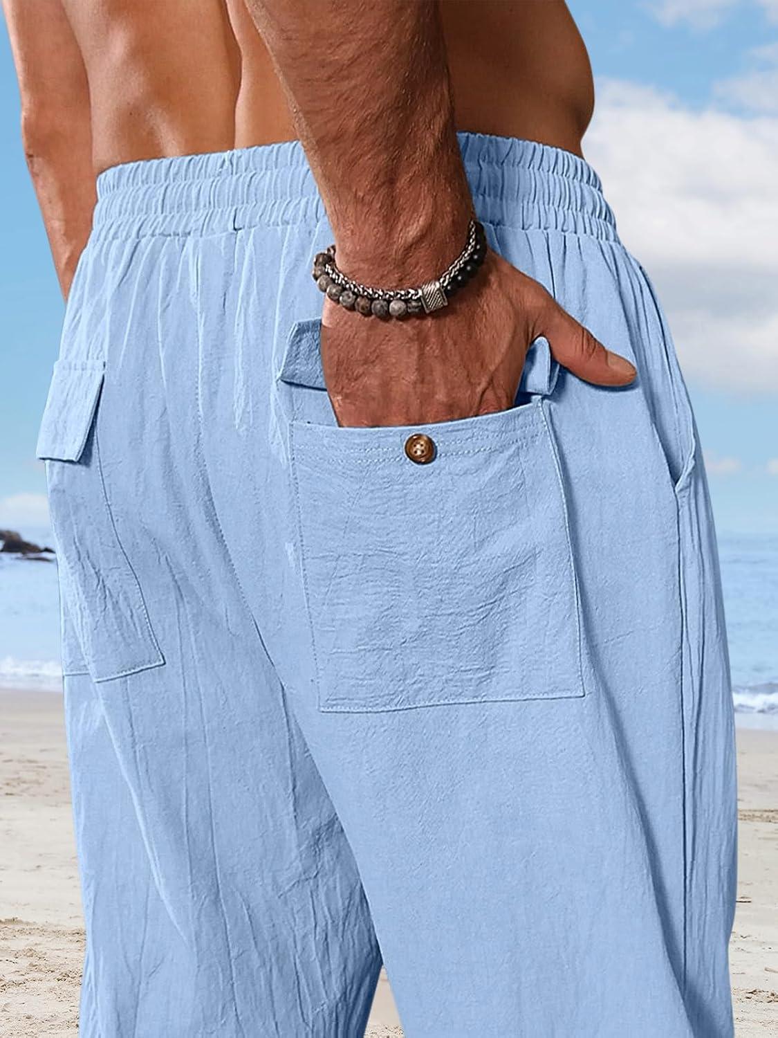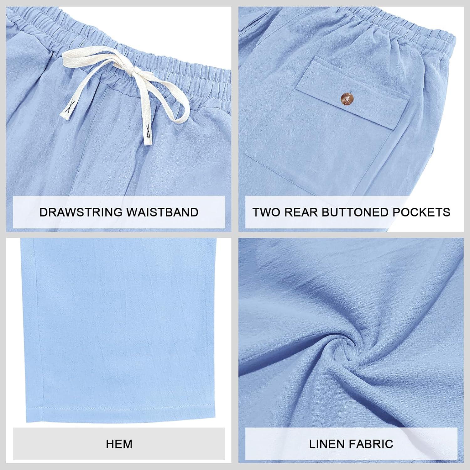 Mens Linen Pants Casual Summer Beach Pants Elastic Waist Drawstring Lightweight Vacation Trousers with Pockets(Blue)