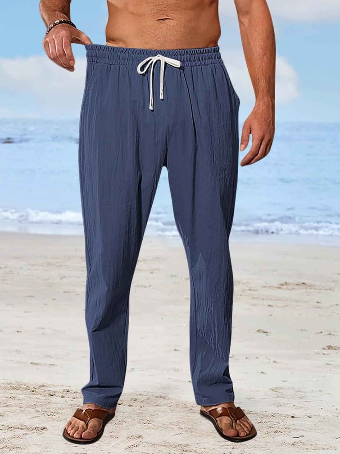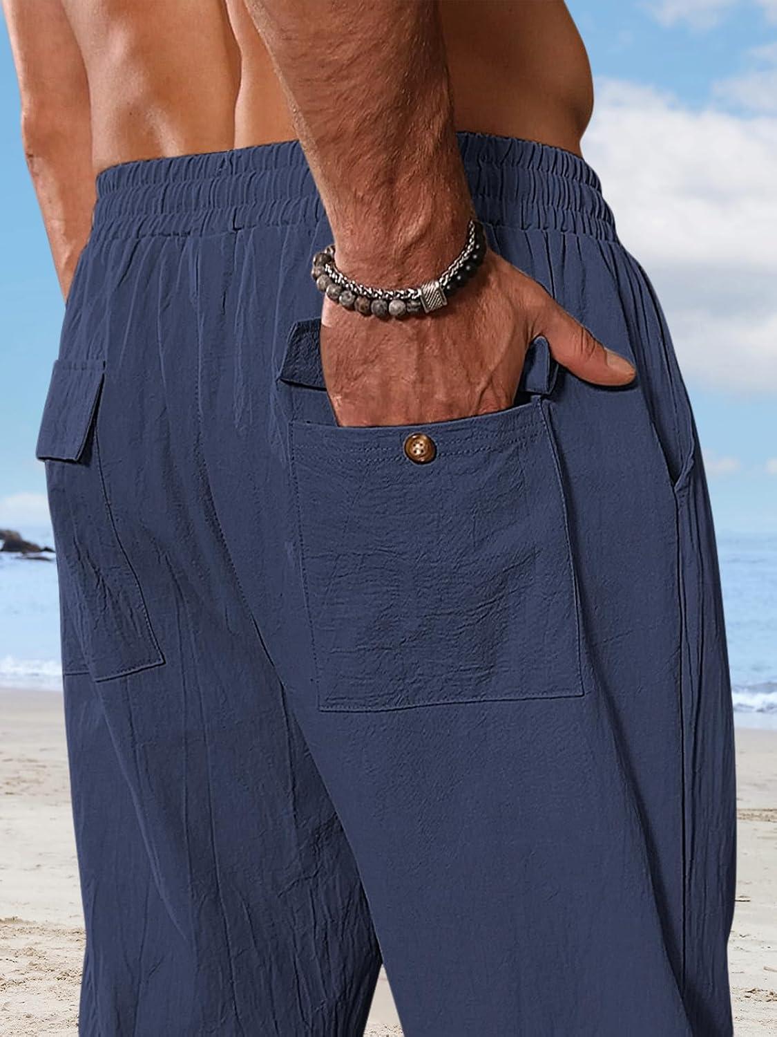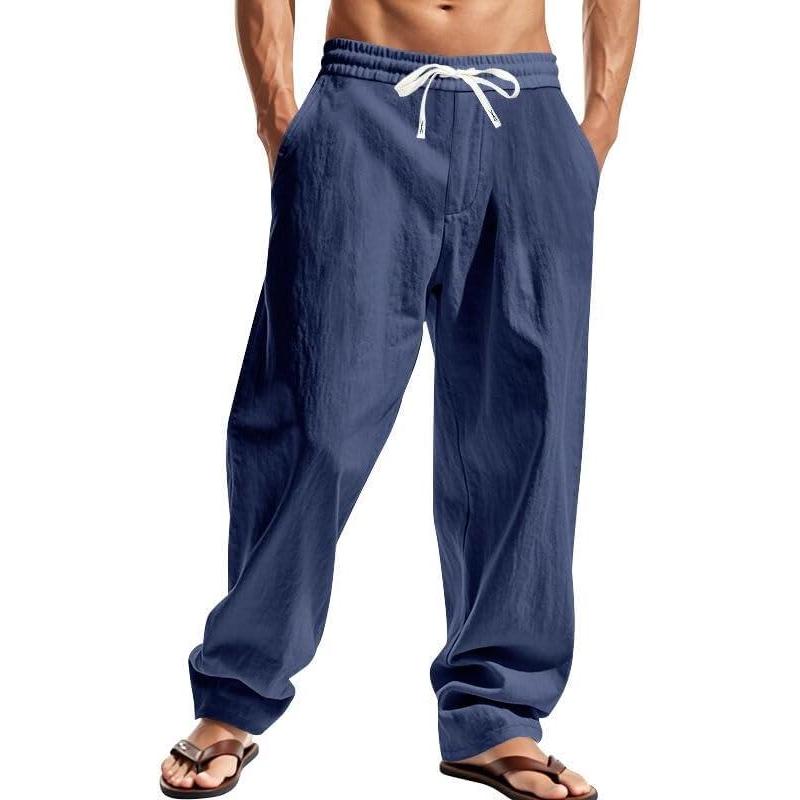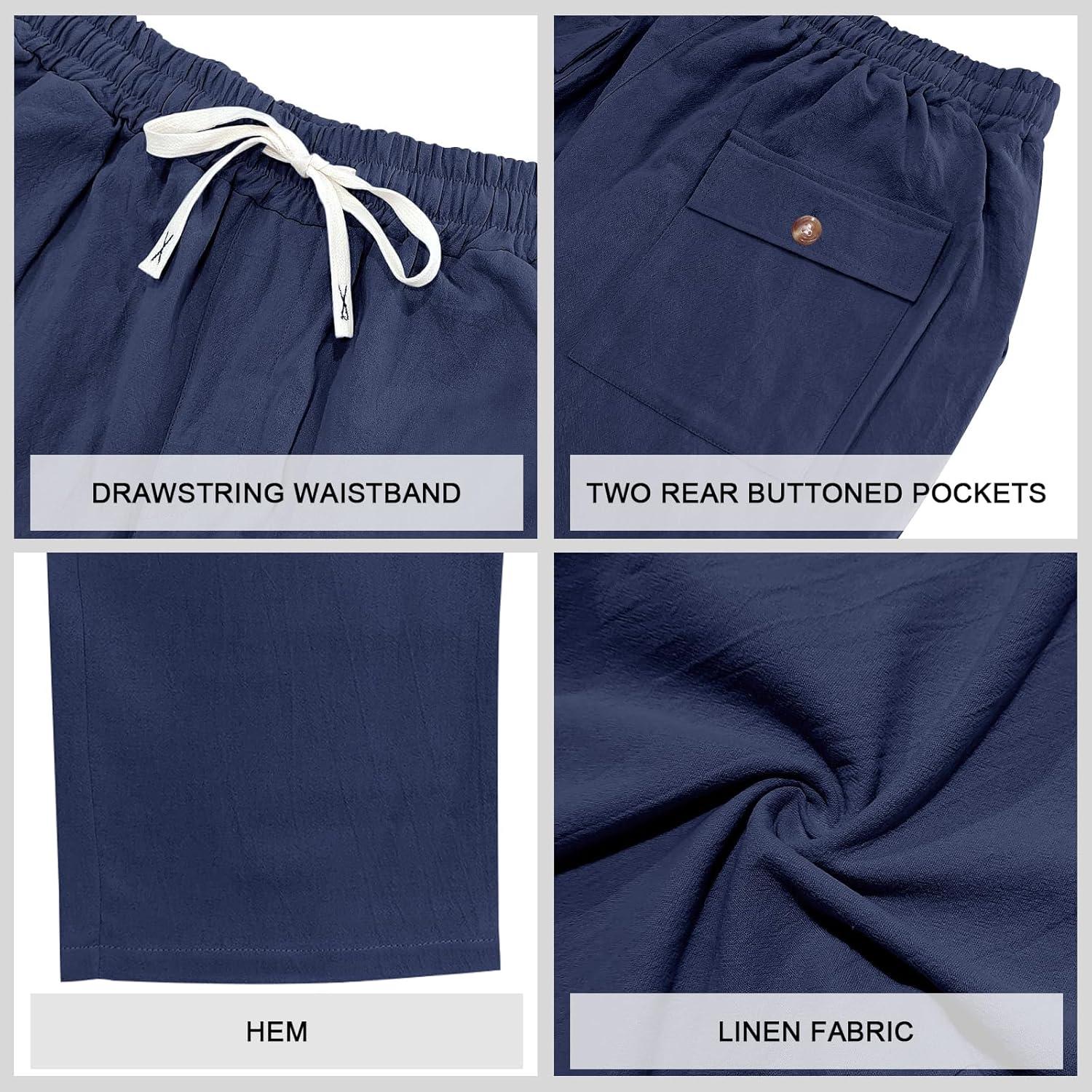 Mens Linen Pants Casual Summer Beach Pants Elastic Waist Drawstring Lightweight Vacation Trousers with Pockets(Navy)