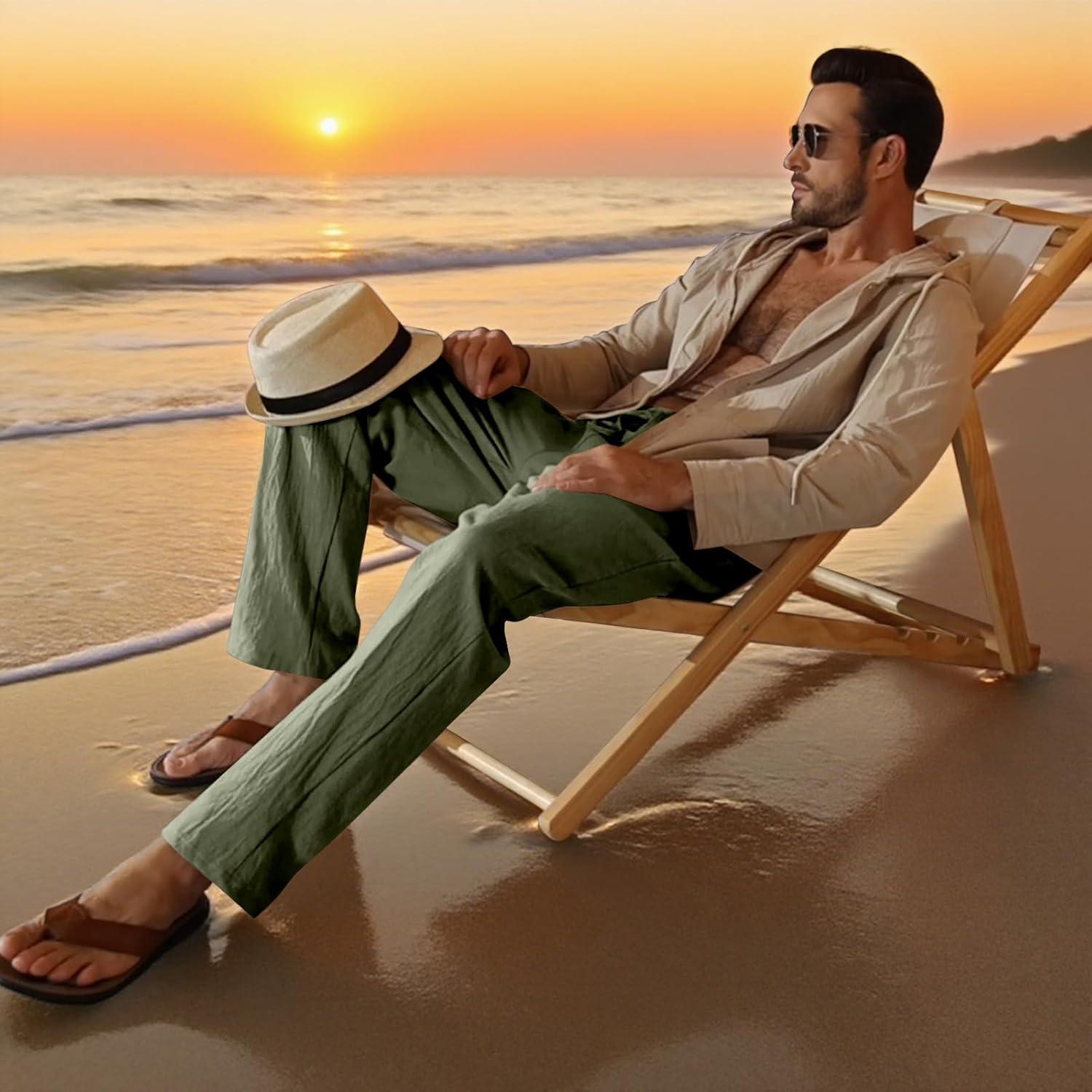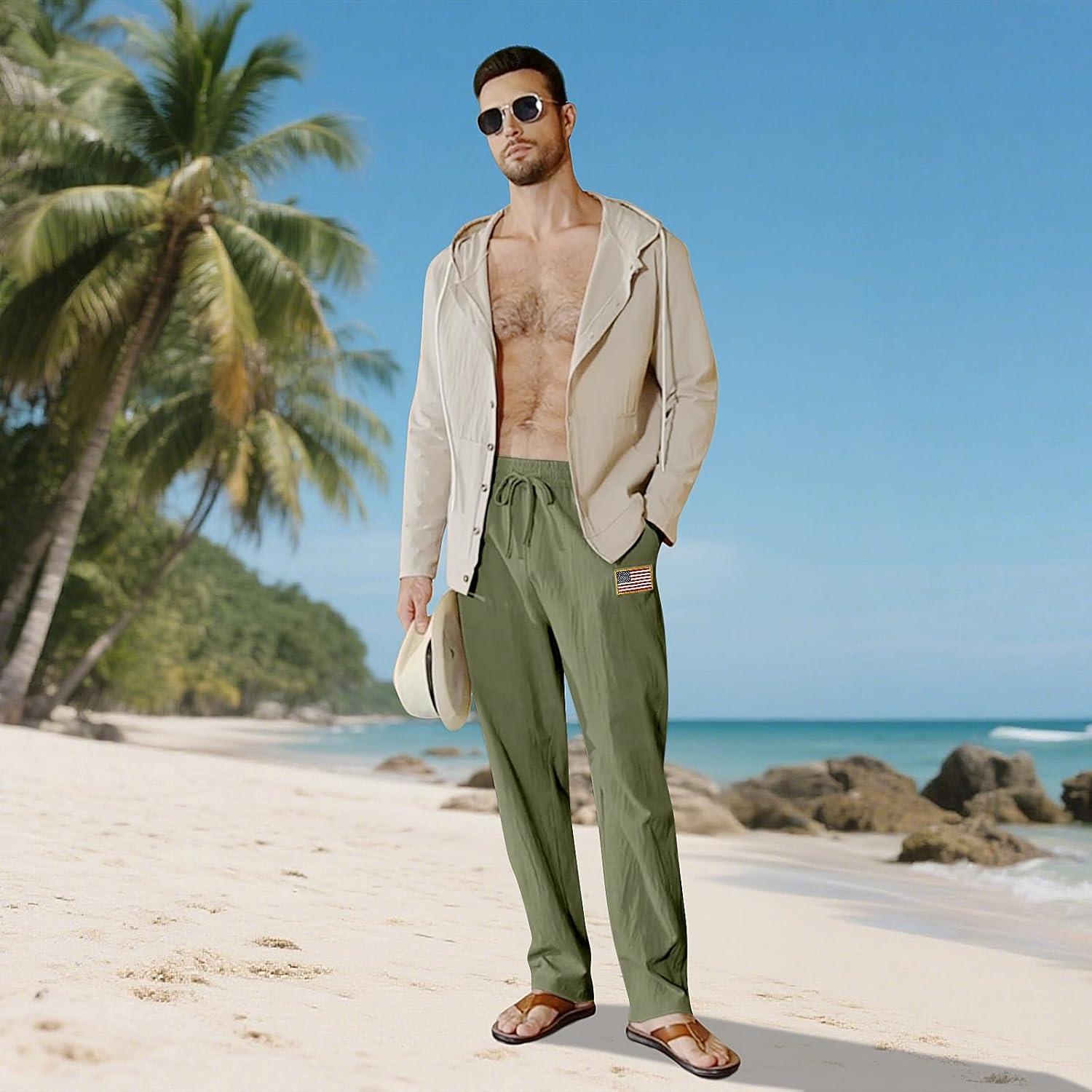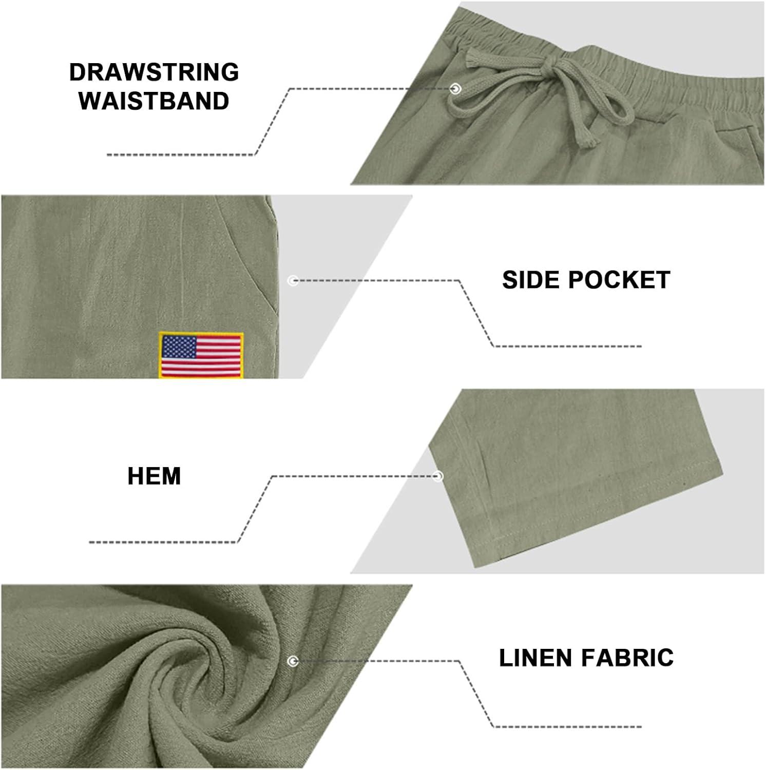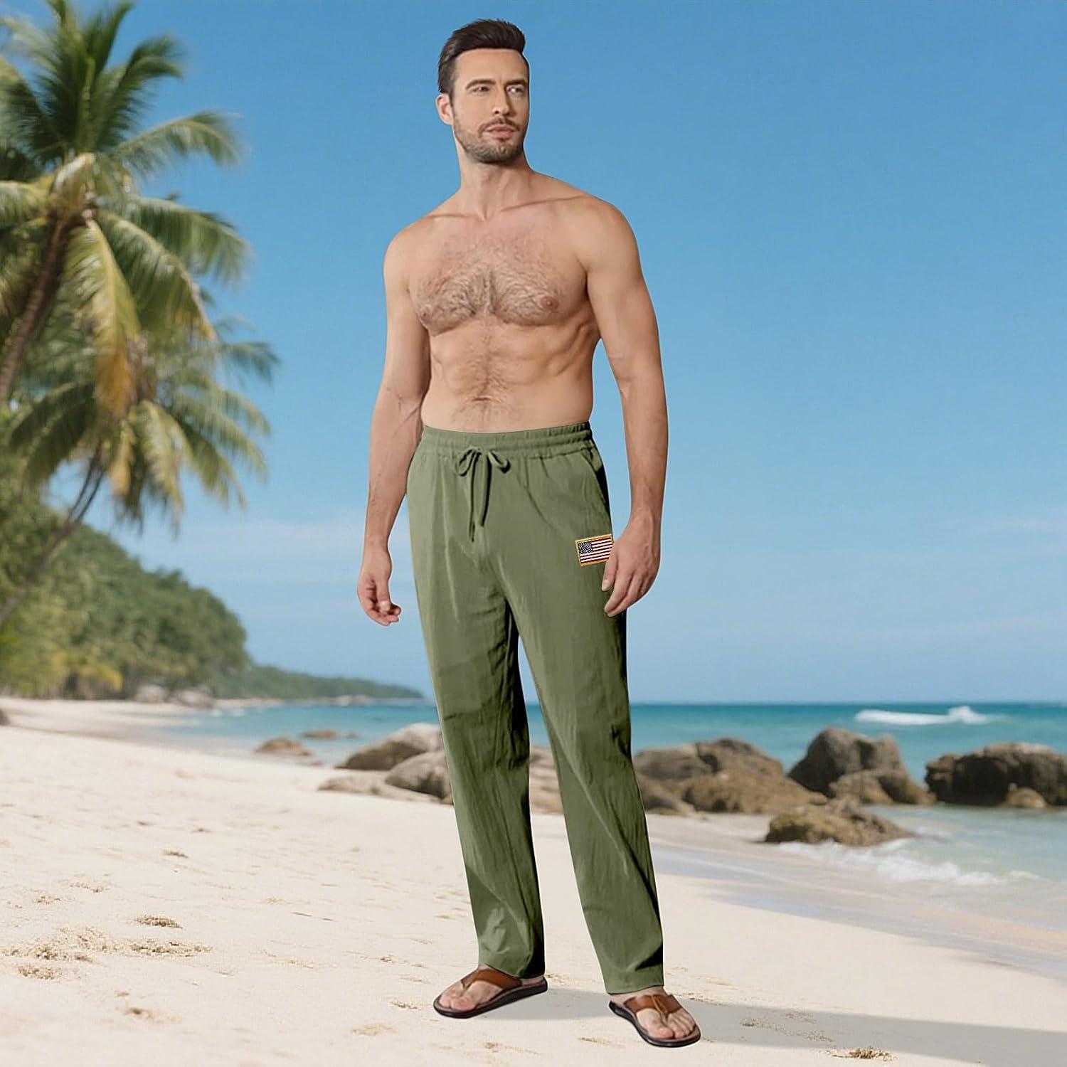 Mens Linen Pants Elastic Waist Drawstring Summer Beach Yoga Pants Wide Leg Trousers with Flag Label(Army Green)