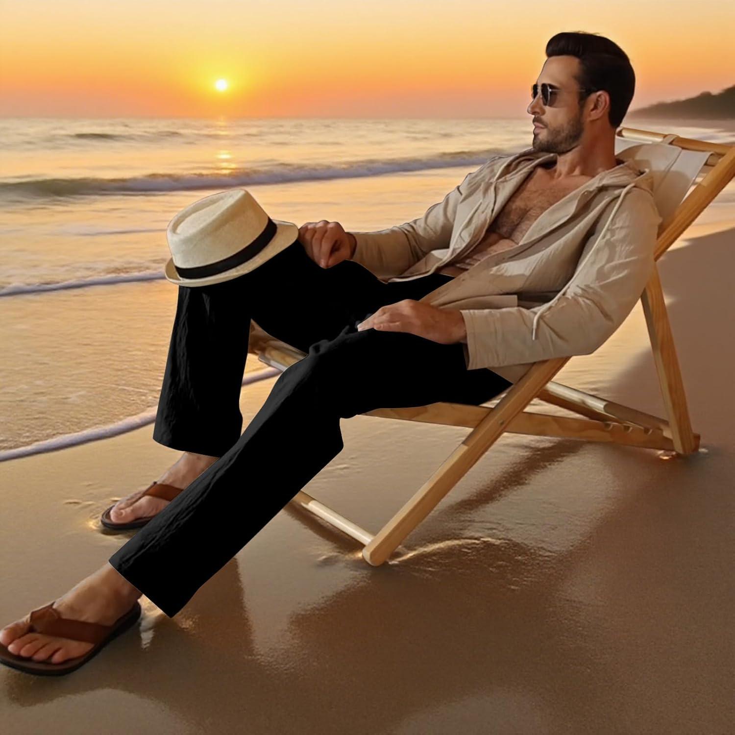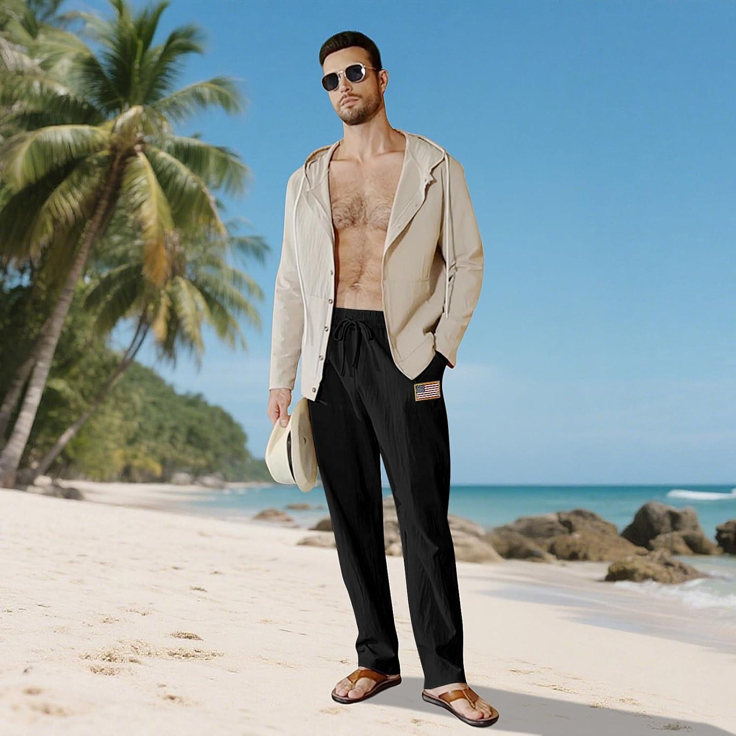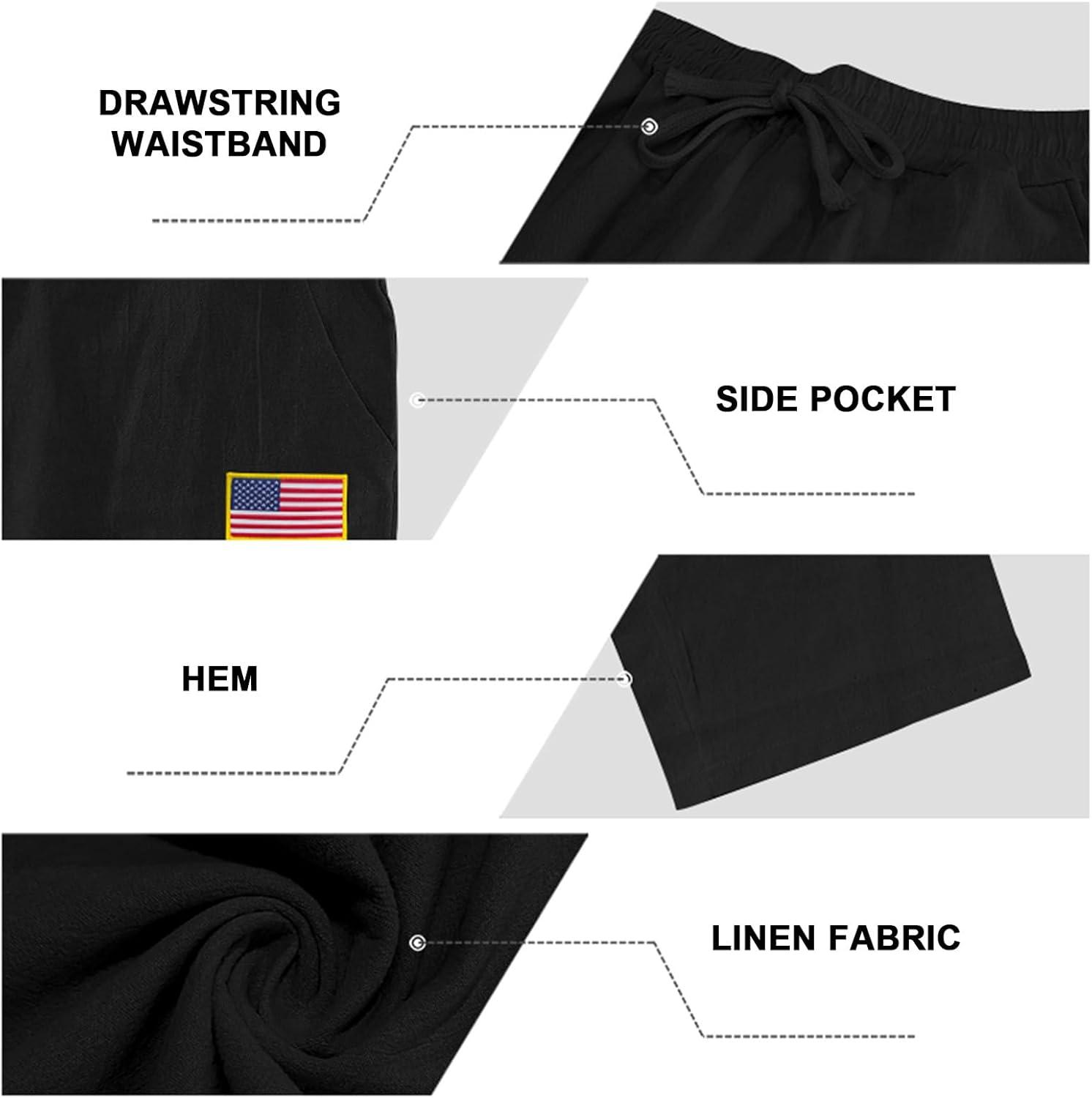 Mens Linen Pants Elastic Waist Drawstring Summer Beach Yoga Pants Wide Leg Trousers with Flag Label(Black)