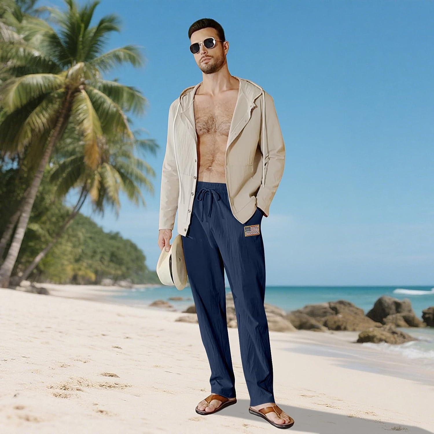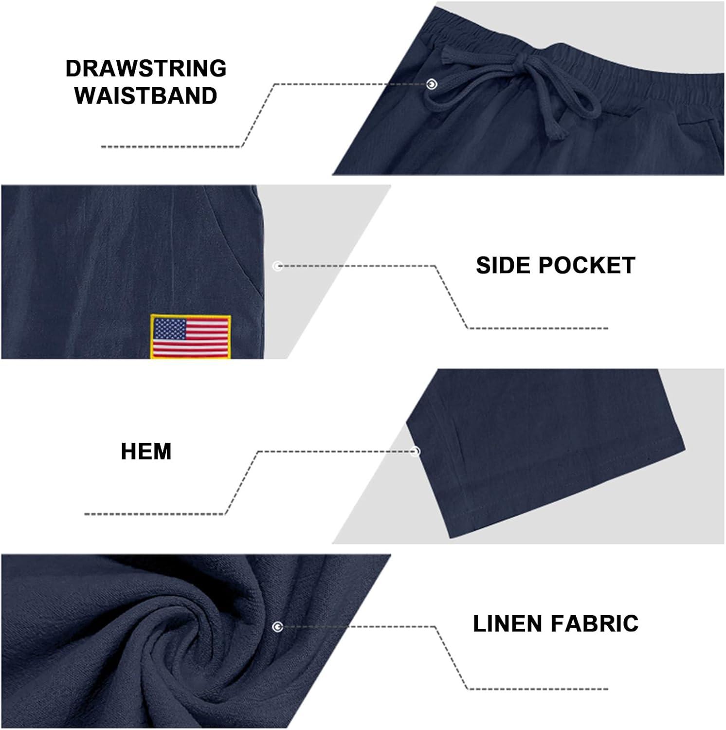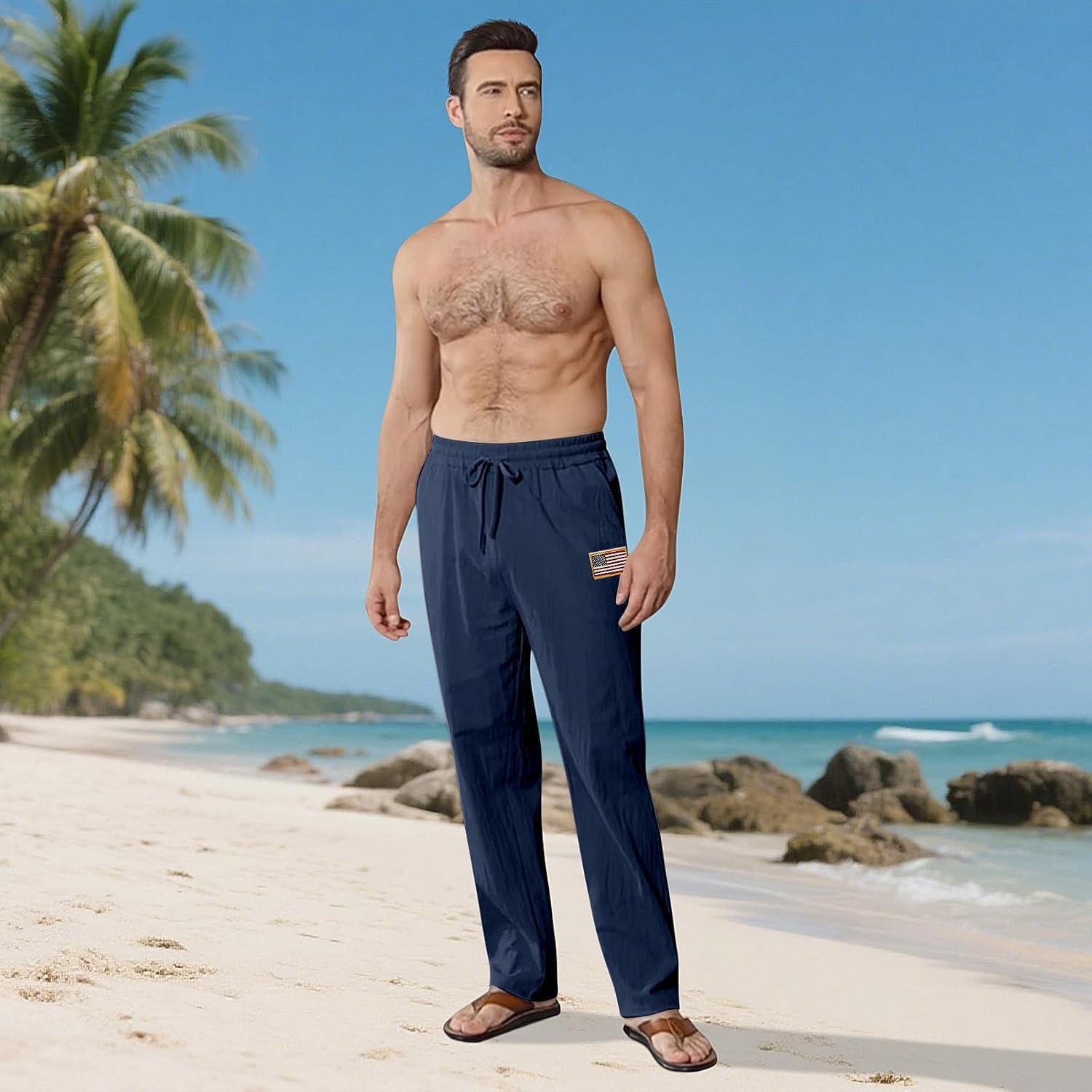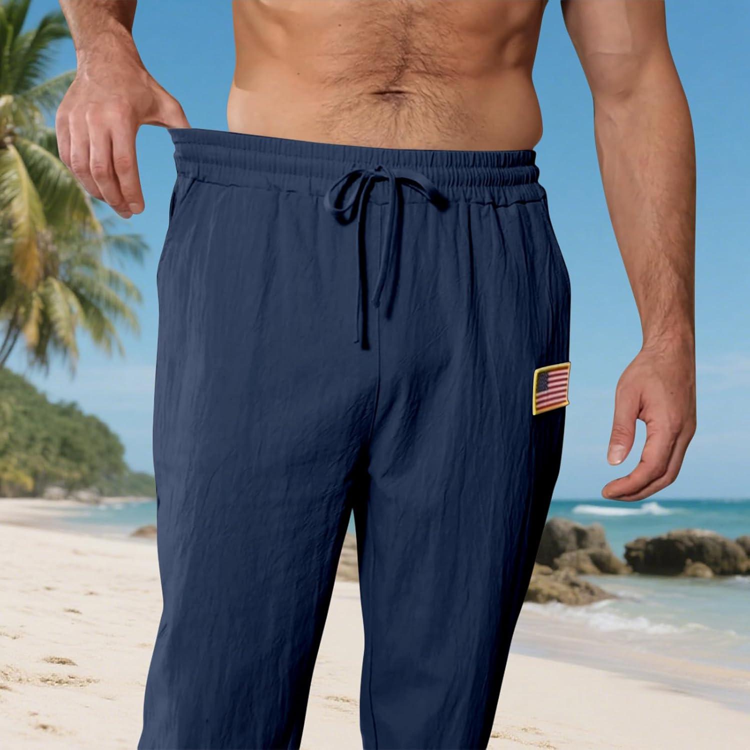 Mens Linen Pants Elastic Waist Drawstring Summer Beach Yoga Pants Wide Leg Trousers with Flag Label(Navy)