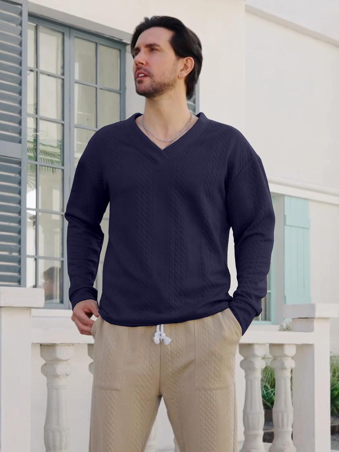 Men’s V-Neck Sweatshirt Casual Block Striped Long Sleeve Pullover Baggy Knitted Shirts(Navy)