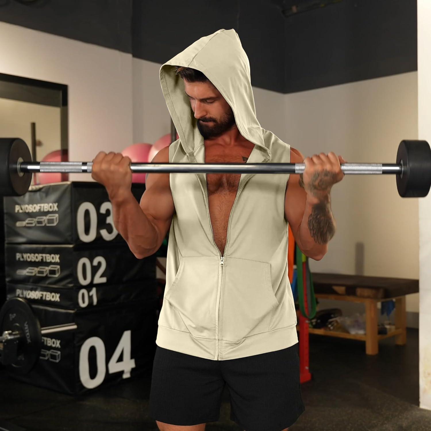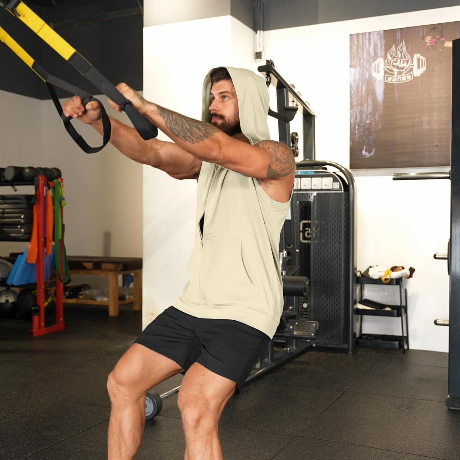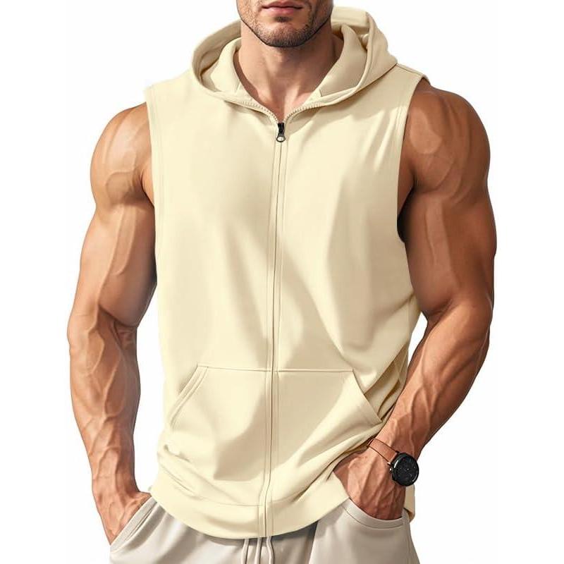 Men’s Workout Hooded Tank Tops Zip Up Sleeveless Gym Shirts Bodybuilding Hoodies Muscle Cut Off T Shirt(Apricot)