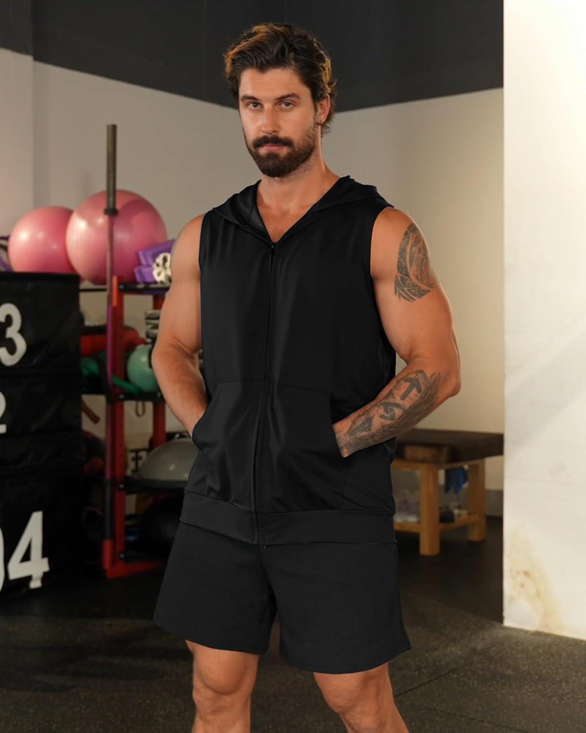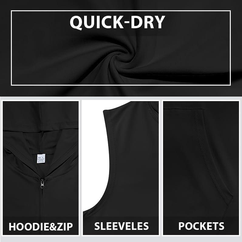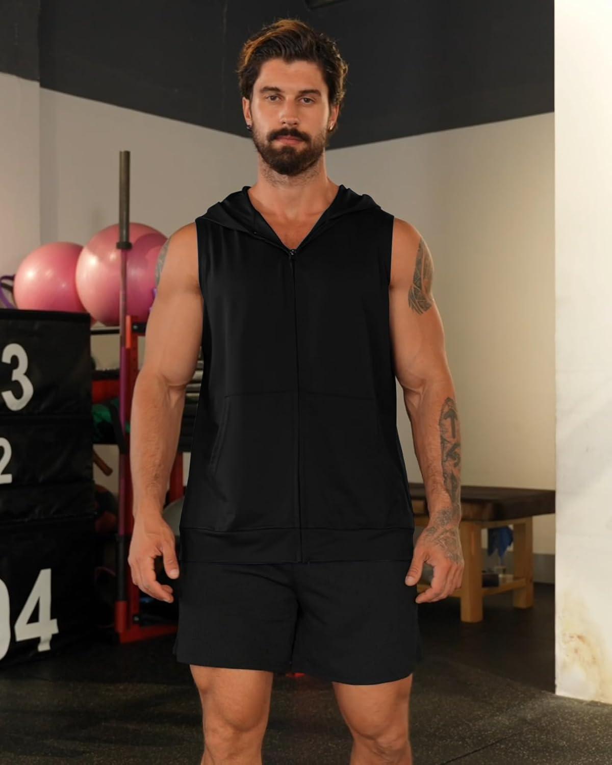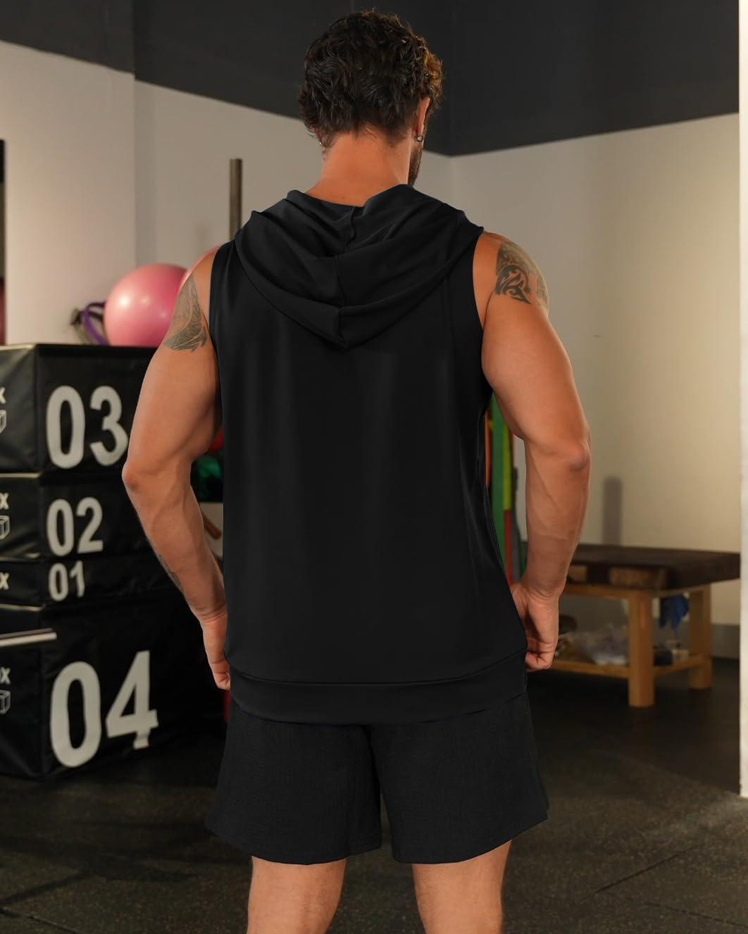 Men’s Workout Hooded Tank Tops Zip Up Sleeveless Gym Shirts Bodybuilding Hoodies Muscle Cut Off T Shirt(Black)